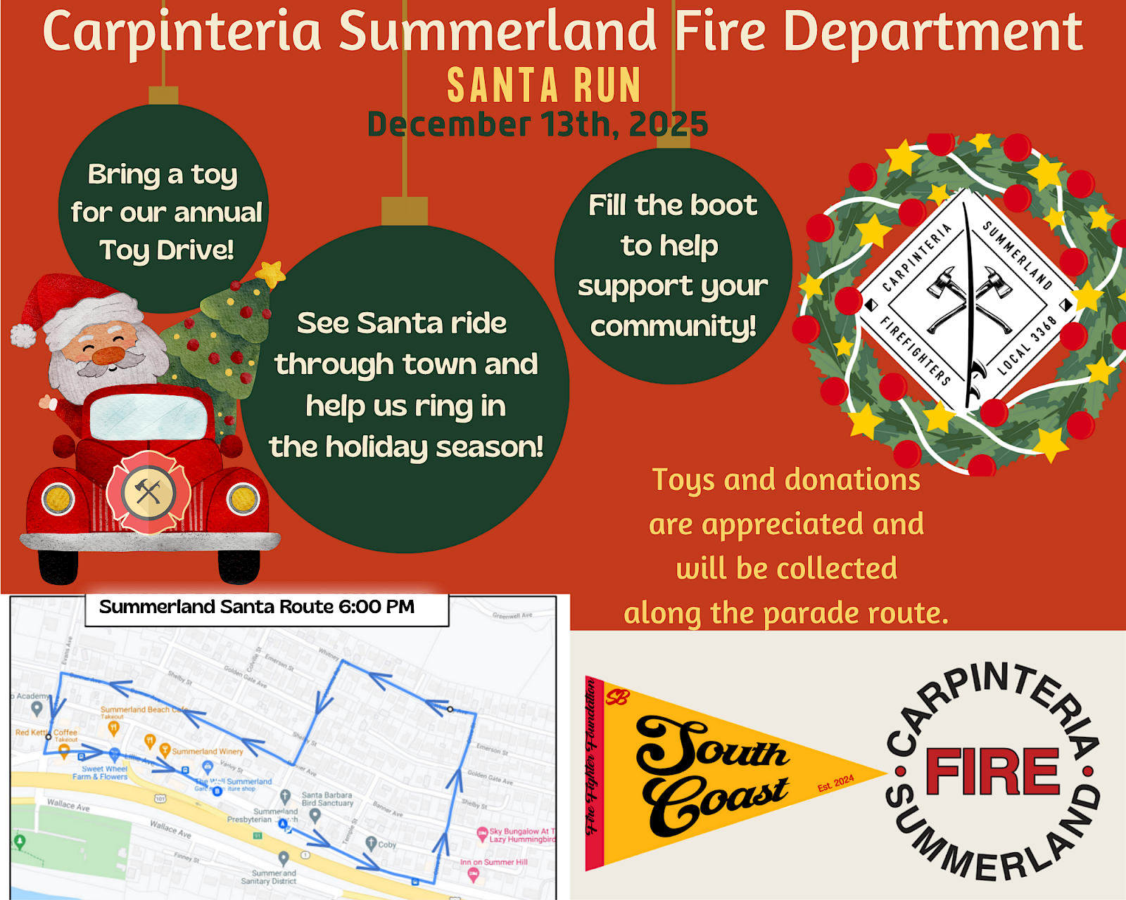 SCA Special Meeting and open Q&A. Special Guests Chief Kovach, Fire Marshall Mike LoMonaco from the Carpinteria-Summerland Fire District, and from the County of SB Sheriff’s Department, Lieutenant Rich Brittingham, and an undercover officer. Also included is a message from Nick Turner, GM of the Montecito Water District. 5:30 – 7:00 pm at the Summerland Church.